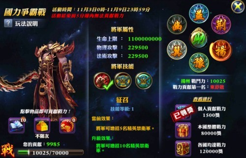 活動內容:活動期間內,到王城南門-國力爭霸將軍(鎮國神將)NPC,玩家通過從爭霸將軍處領取每日任務,完成任務可以獲得相應的獎勵以及貢獻度的增加,貢獻度為玩家個人累計,同時該貢獻度也會累積到國家總體戰力上。